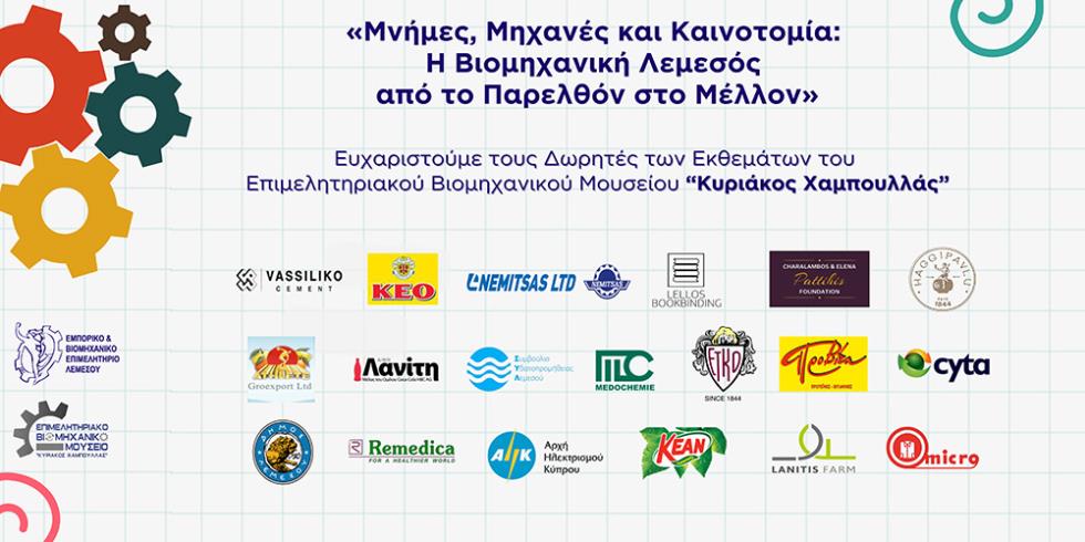 Ιδιαίτερες ευχαριστίες στην οικογένεια Χαμπουλλά, βασικό χορηγό του Μουσείου, καθώς και στους δεκαεννέα δωρητές – μέλη του Επιμελητηρίου, χάρη στους οποίους εκτίθενται σήμερα σαράντα έξι μοναδικά εκθέματα και μηχανήματα. Ευχαριστίες στην εταιρεία SignalGeneriX και στον Οργανισμό Νεολαίας Κύπρου για την παρουσίαση νέων τεχνολογιών, όπως και στην εταιρεία Χαραλαμπίδης Κρίστης για τη διάθεση προϊόντων.